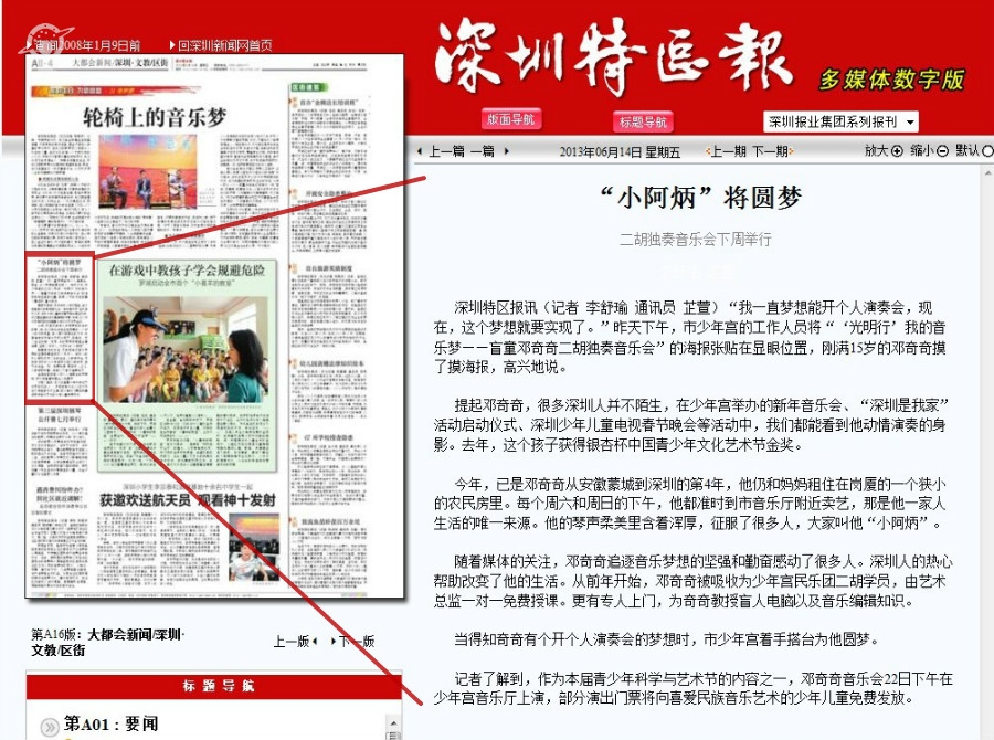 〖深圳特区报〗“小阿炳”将圆梦