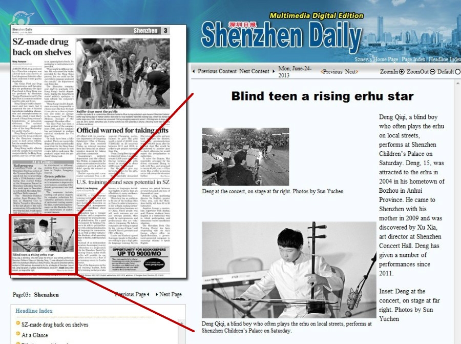 〖Shenzhen Daily〗Blind teen a rising erhu star