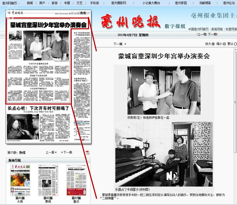 蒙城县盲童邓奇奇用手中的一把二胡在深圳街头演绎出动人的音乐,受到当地媒体关注,被称为“二胡神童”。