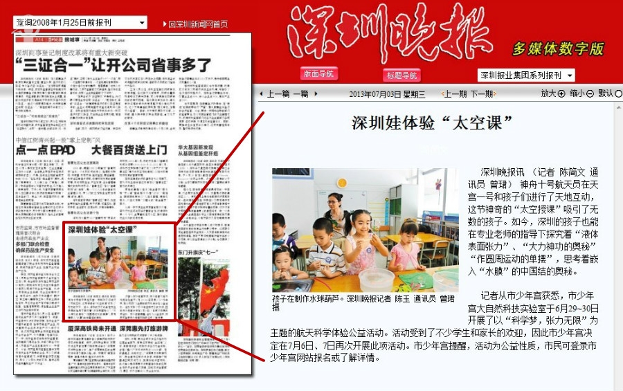 深圳晚报讯 (记者 陈简文 通讯员 曾珺) 神舟十号航天员在天宫一号和孩子们进行了天地互动,这节神奇的“太空授课”吸引了无数的孩子。如今,深圳的孩子也能在专业老师的指导下探究着“液体表面张力”、“大力神功的奥秘”“作圆周运动的单摆”,思考着嵌入“水膜”的中国结的奥秘。