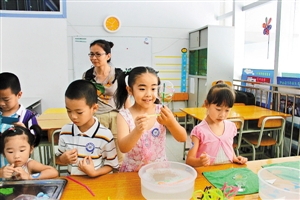 孩子在制作水球葫芦。深圳晚报记者 陈玉 通讯员 曾珺 摄