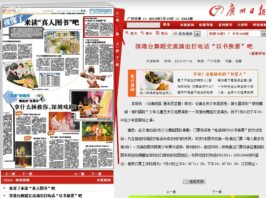 〖广州日报〗深港台舞蹈交流演出打电话“以书换票”吧