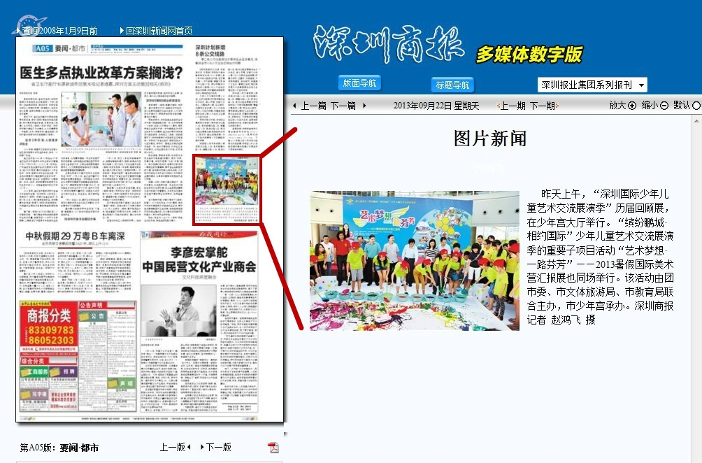 昨天上午,“深圳国际少年儿童艺术交流展演季”历届回顾展,在少年宫大厅举行。“缤纷鹏城·相约国际”少年儿童艺术交流展演季的重要子项目活动“艺术梦想·一路芬芳”——2013暑假国际美术营汇报展也同场举行。该活动由团市委、市文体旅游局、市教育局联合主办,市少年宫承办。深圳商报记者 赵鸿飞 摄