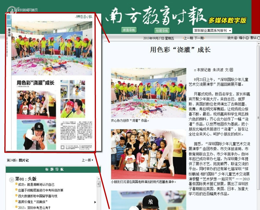 据悉,“深圳国际少年儿童艺术交流展演季”由团市委、市文体旅游局、市教育局联合主办、市少年宫承办。自06年起已成功举办七届,为深圳青少年提供了展示才艺、拓宽眼界、联谊交流的平台。同时举办的还有第七届深圳“缤纷鹏城·相约国际”少年儿童艺术交流展演季暨“艺术梦想·一路芬芳”——2013暑假国际美术营汇报展,展出了深圳孩子暑期前往英国、美国、日本、加拿大学习后的近百幅美术作品。