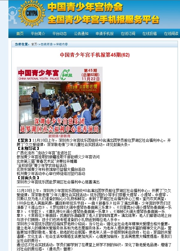 〖中国青少年宫手机报〗深圳市少年宫弦乐团赴罗湖区社会福利中心慈善演出