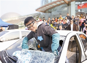 上午11时许,“砸车”环节正式开始。一男一女“被困水中”,必须砸开玻璃才能获得一线生机。高跟鞋、手机、头枕……两人在车中奋战了5分钟有余,可玻璃仍然纹丝不动。无奈,两人只得求助。