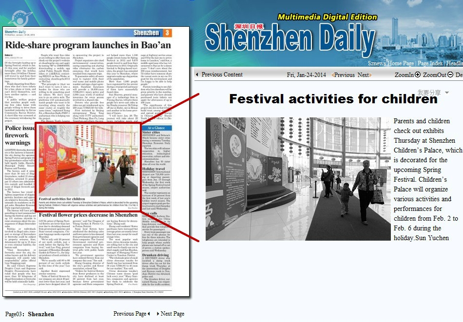 Parents and children check out exhibits Thursday at Shenzhen Children’s Palace, which is decorated for the upcoming Spring Festival. Children’s Palace will organize various activities and performances for children from Feb. 2 to Feb. 6 during the holiday.