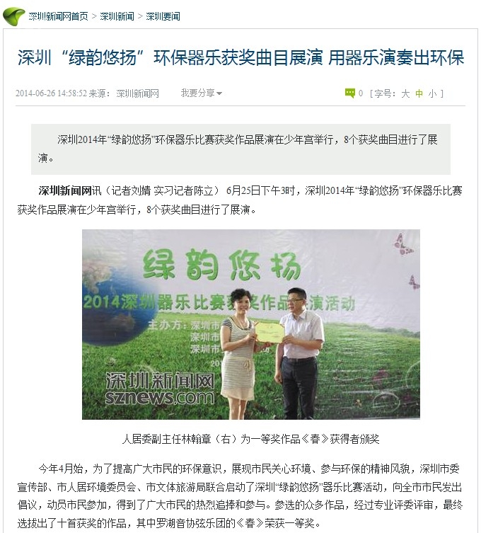 今年4月始,为了提高广大市民的环保意识,展现市民关心环境、参与环保的精神风貌,深圳市委宣传部、市人居环境委员会、市文体旅游局联合启动了深圳“绿韵悠扬”器乐比赛活动,向全市市民发出倡议,动员市民参加,得到了广大市民的热烈追捧和参与。参选的众多作品,经过专业评委评审,最终选拔出了十首获奖的作品,其中罗湖音协弦乐团的《春》荣获一等奖。