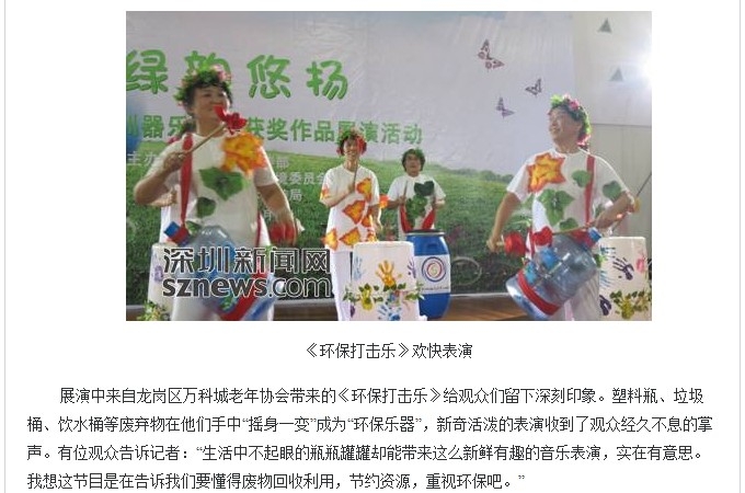 展演中来自龙岗区万科城老年协会带来的《环保打击乐》给观众们留下深刻印象。塑料瓶、垃圾桶、饮水桶等废弃物在他们手中“摇身一变”成为“环保乐器”,新奇活泼的表演收到了观众经久不息的掌声。有位观众告诉记者:“生活中不起眼的瓶瓶罐罐却能带来这么新鲜有趣的音乐表演,实在有意思。我想这节目是在告诉我们要懂得废物回收利用,节约资源,重视环保吧。”