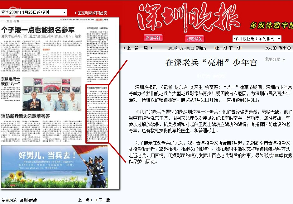 深圳晚报讯 (记者 赵东眉 实习生 佘薇薇)“八一”建军节期间,深圳市少年宫将举办《我们的老兵》大型老兵影像与青少年爱国教育专题展,为深圳市民及青少年奉献一场特殊的精神盛宴。展览从7月31日开始,一直持续到8月3日。