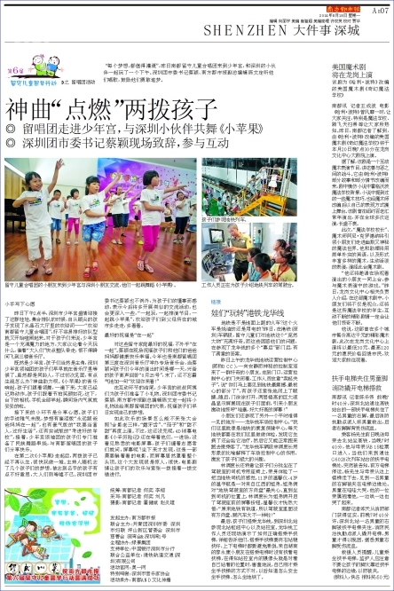 “每个梦想,都值得灌溉”,昨日南都留守儿童合唱团来到少年宫,和深圳的小伙伴一起玩了一个下午。深圳团市委书记蔡颖、南方都市报副总编辑陈文定听他们唱歌,鼓励他们勇敢追梦。