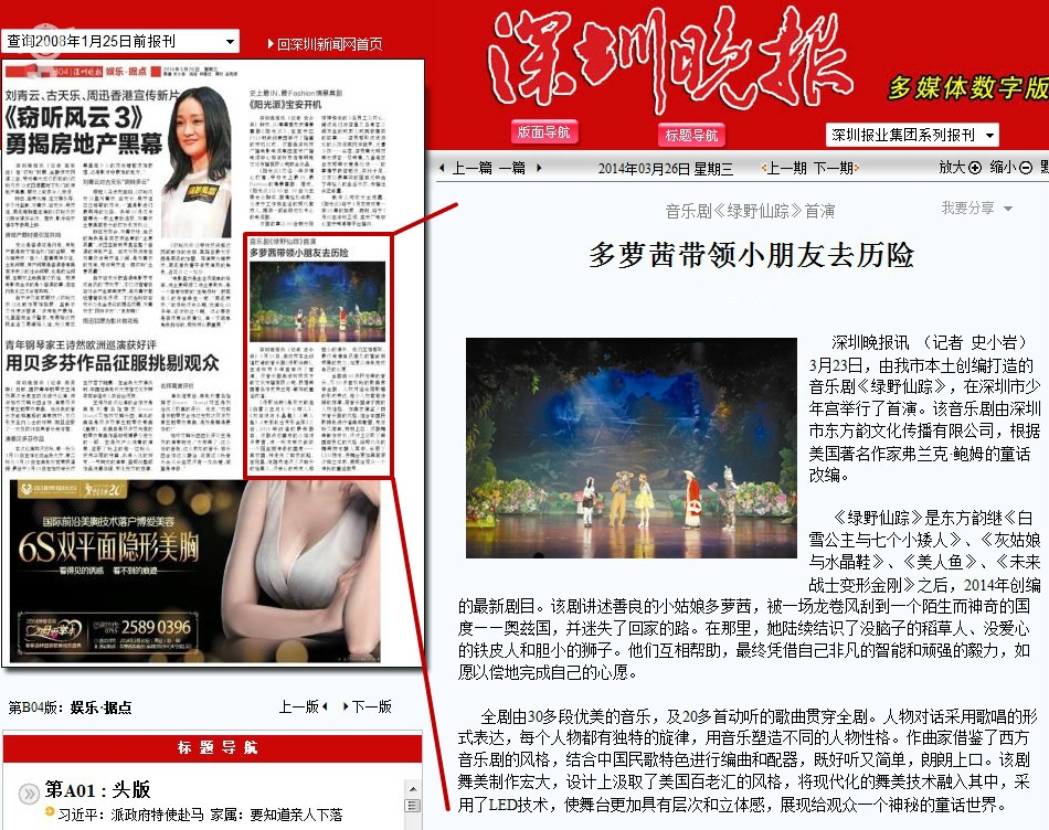 深圳晚报讯 (记者 史小岩) 3月23日,由我市本土创编打造的音乐剧《绿野仙踪》,在深圳市少年宫举行了首演。该音乐剧由深圳市东方韵文化传播有限公司,根据美国著名作家弗兰克·鲍姆的童话改编。