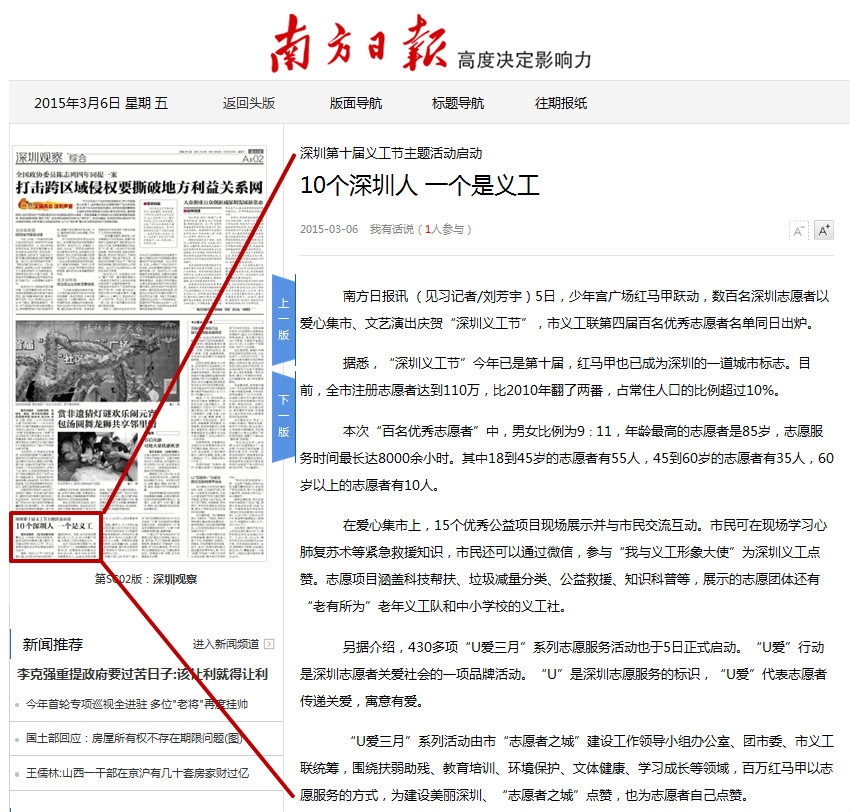 据悉,“深圳义工节”今年已是第十届,红马甲也已成为深圳的一道城市标志。目前,全市注册志愿者达到110万,比2010年翻了两番,占常住人口的比例超过10%。