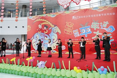 本报讯 (记者李恩 通讯员曾珺)从大年初三开始,深圳市少年宫里一片欢声笑语,“欢乐过春节”系列活动在少年宫举行,热闹的文艺表演、温馨的互动游戏、趣味微信猜谜、欢乐的参观体验……迎来了现场观众的热烈掌声,为祥和的农历新年增添了一派欢乐喜庆的景象,让孩子们在少年宫度过了一个欢乐而富有意义的春节。