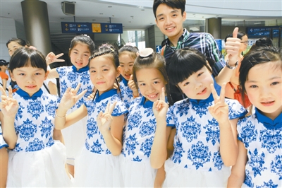 Girls pose for a photo before giving a dance performance at the Children’s Palace in Futian District yesterday. Thousands of children participated in a series of events over the weekend and today, celebrating the 66th International Children’s Day. Sun Yuchen
