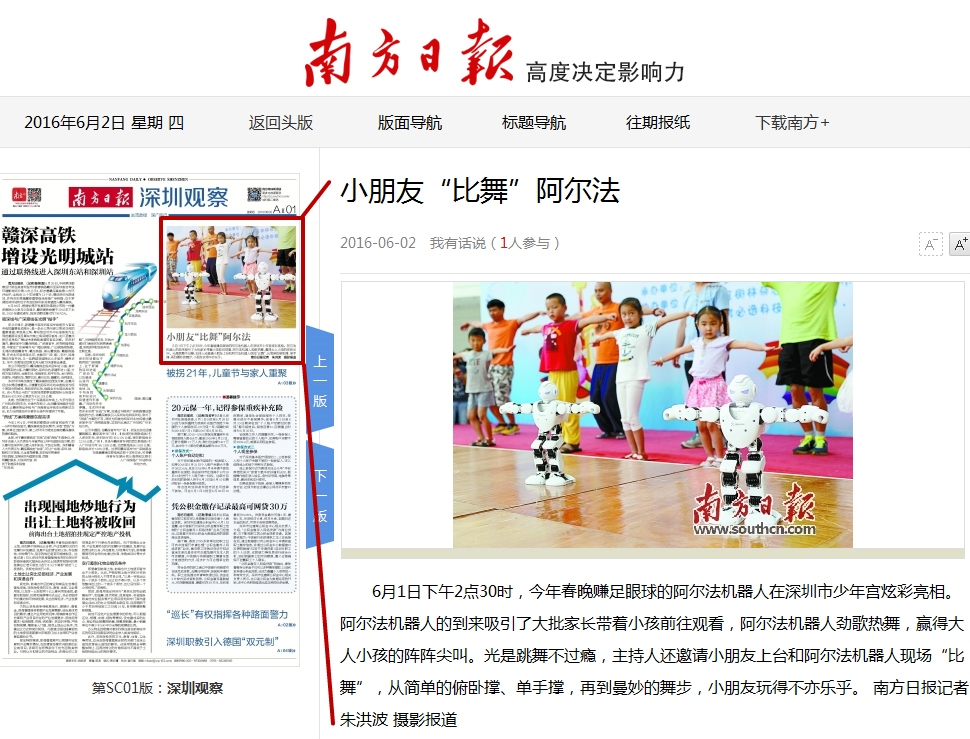 6月1日下午2点30时,今年春晚赚足眼球的阿尔法机器人在深圳市少年宫炫彩亮相。阿尔法机器人的到来吸引了大批家长带着小孩前往观看,阿尔法机器人劲歌热舞,赢得大人小孩的阵阵尖叫。光是跳舞不过瘾,主持人还邀请小朋友上台和阿尔法机器人现场“比舞”,从简单的俯卧撑、单手撑,再到曼妙的舞步,小朋友玩得不亦乐乎。 南方日报记者 朱洪波 摄影报道
