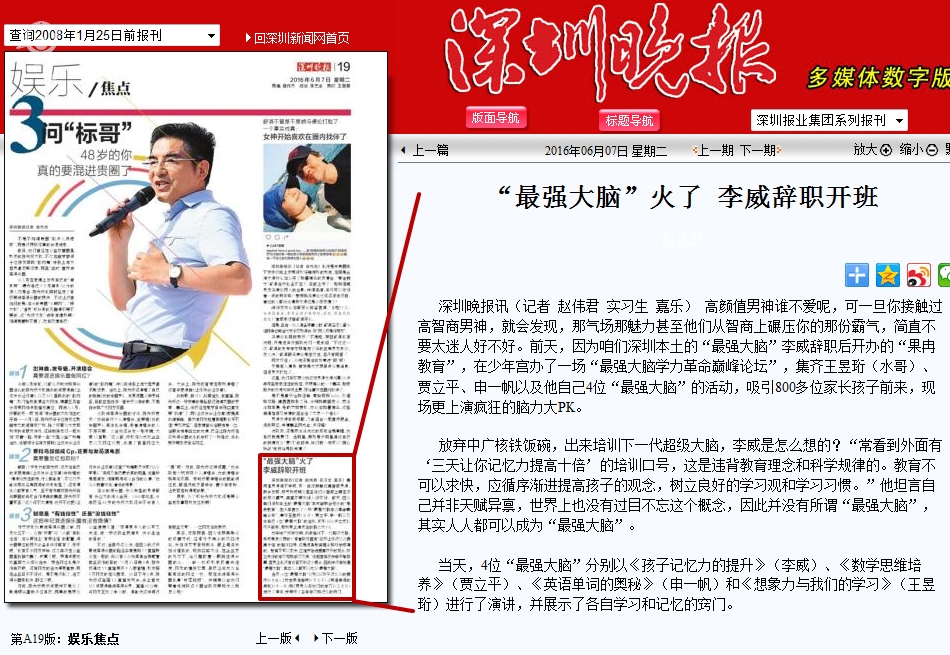 〖深圳晚报〗“最强大脑”火了 李威辞职开班