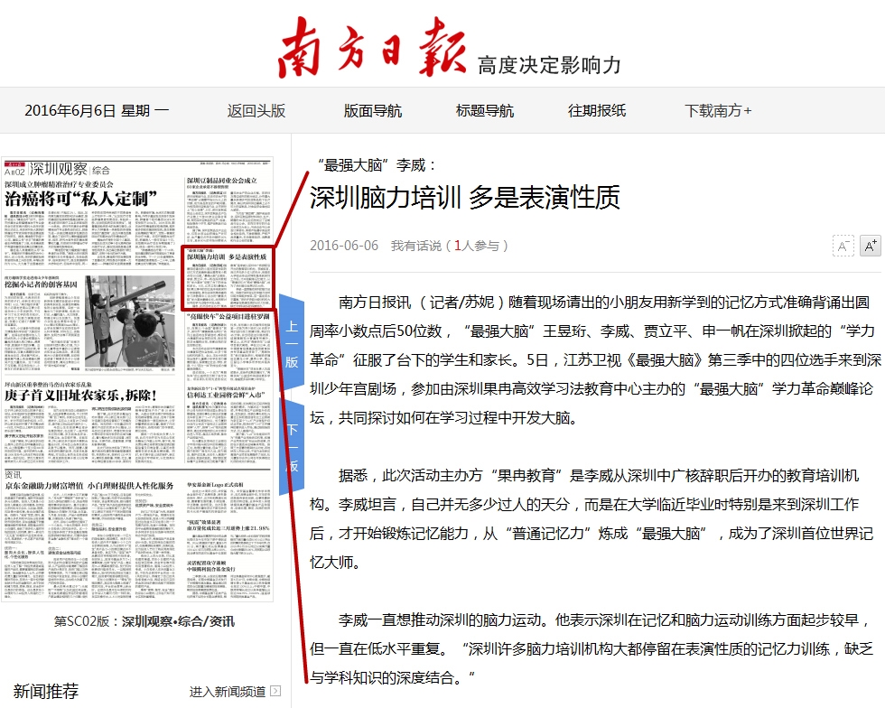 李威一直想推动深圳的脑力运动。他表示深圳在记忆和脑力运动训练方面起步较早,但一直在低水平重复。“深圳许多脑力培训机构大都停留在表演性质的记忆力训练,缺乏与学科知识的深度结合。”