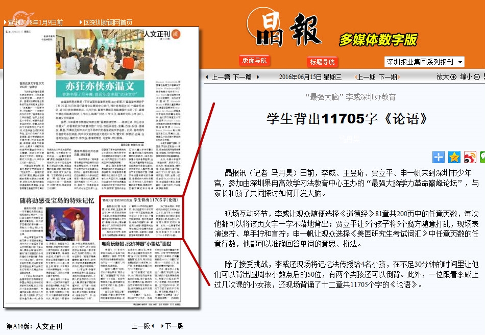 除了接受挑战,李威还现场将记忆法传授给4名小孩,在不足30分钟的时间里让他们可以背出圆周率小数点后的50位,有两个男孩还可以倒背。此外,一位跟着李威上过几次课的小女孩,还现场背诵了十二章共11705个字的《论语》。