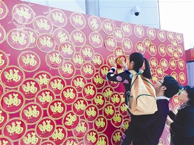 A girl puts her New Year wish on the wall of fu (meaning blessing or happiness) at Shenzhen Children’s Palace.