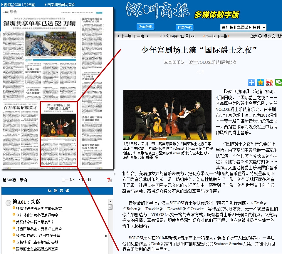 【深圳商报讯】(记者 祁琦)4月6日晚,“国际爵士之夜”——李高阳中美欧爵士名家乐队、波兰VOLOSI爵士乐队音乐会,在深圳市少年宫剧场上演。作为2017深圳“一带一路”国际音乐季的演出之一,两组艺术家为观众献上中西两种风格的爵士音乐。