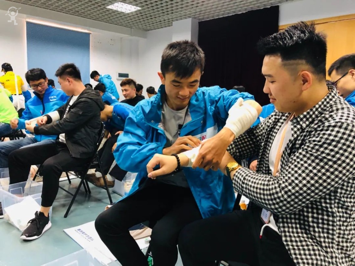 ▲外卖骑手在接受应急救援志愿者专业培训