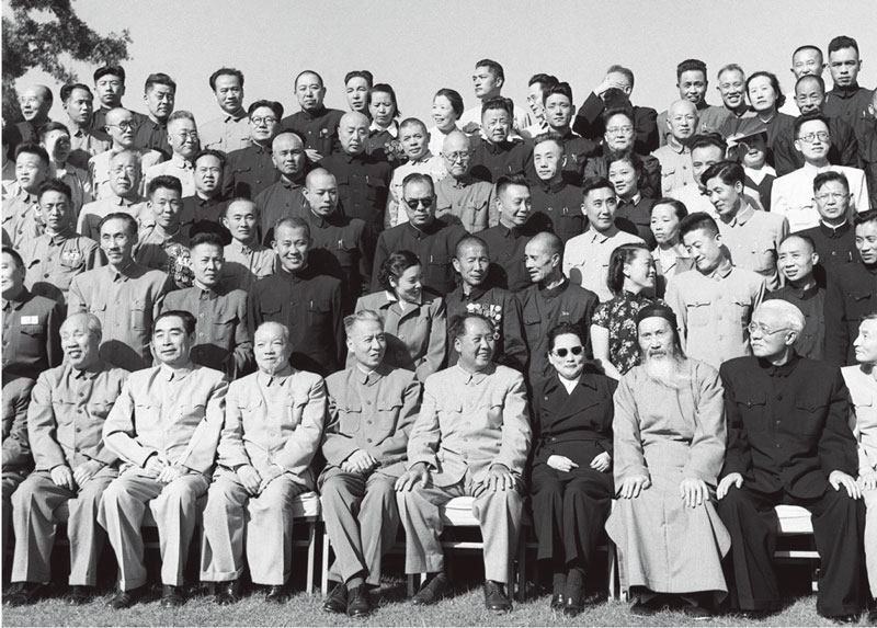 中华人民共和国第一届全国人民代表大会第一次会议全体代表于1954年9月21日合影。 毛泽东主席和代表们在一起。前排左起:董必武、周恩来、李济深、刘少奇、毛泽东、宋庆龄、张澜、林伯渠。 新华社稿 侯波/摄