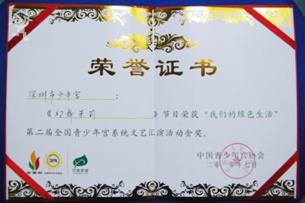 2010年7月《幻舞茉莉》荣获“我们的绿色生活”第二届全国青少年宫系统文艺汇演活动金奖“最佳组织奖” 2010年07月19日 2010年7月《幻舞茉莉》荣获“我们的绿色生活”第二届全国青少年宫系统文艺汇演活动金奖“最佳组织奖”